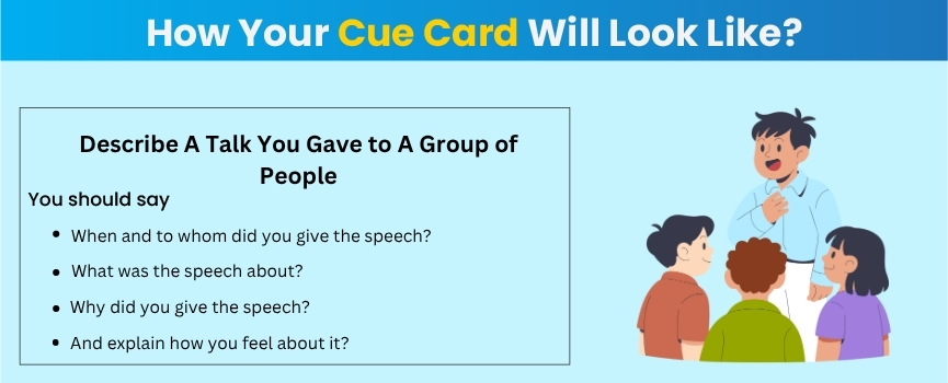 The cue card is a crucial component of the IELTS speaking part 2. It is basically a topic card that features 3-4 prompt questions. These prompts are designed to evaluate the ability of a candidate to speak and express their opinions fluently in English.