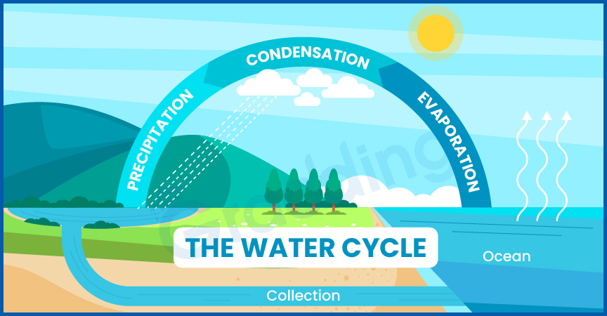 This diagram shows the natural process of the water cycle, which involves the regular movement of water within the Earth and atmosphere through different steps. These are evaporation, condensation, precipitation, and collection.