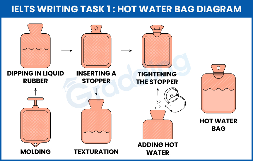 This IELTS writing task 1 process diagram illustrates the process of manufacturing and using a hot water bag. Observe the steps and write the response.