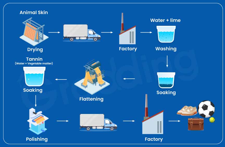 The diagram in the question illustrates how leather products are made for retail. The representation suggests that it is a completely man-made process consisting of three main steps. The process starts with the transportation of raw materials to the factory, and then the material is processed and prepared. After that, the final products are ready.