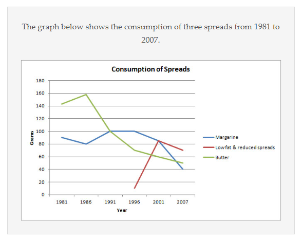 Below is an example of line chart task 1, which talks about the consumption of three spreads. You will see three lines denoting each spread. However, one thing that stands out here is that one of the spreads has no data for the first few years. To boost your IELTS score, you can write an answer to this question: