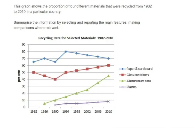 Introduction: This line graph illustrates the recycling rates of four materials: paper and cardboard, glass containers, aluminium cans, and plastics over 28 years from 1982 to 2010.
