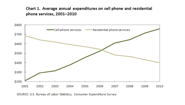 2nd Main Feature: By 2006, the two services achieved equal expenditure levels at around $550. Following this, spending on mobile services surged, peaking at approximately $750 in 2010, nearly quadrupling its initial figure in 2001. In contrast, expenditure on residential phone services continued to decline sharply, especially after 2007, reaching its lowest point by the end of the period.