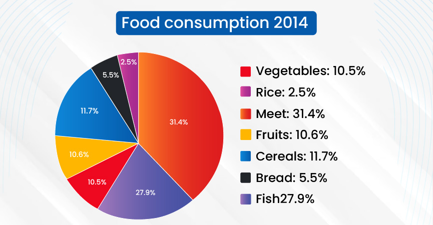 The pie chart provides a detailed breakdown of global food consumption across seven different food categories in 2014. The largest share is attributed to meat, which makes up 31.4% of the total consumption, highlighting its position as the most preferred food type during this period. Following closely behind is fish, accounting for 27.9% of global consumption, indicating a strong preference for seafood worldwide.